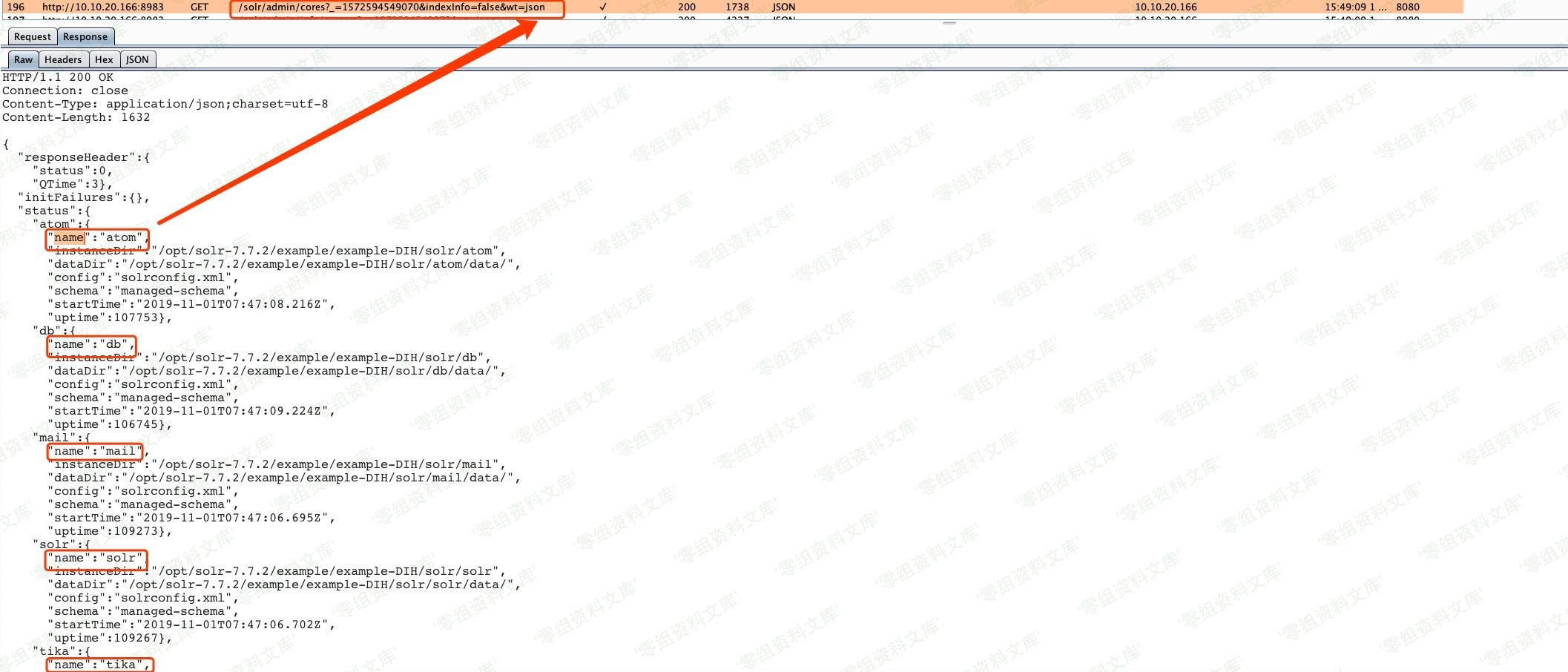 用户在打开网站时候,再burpsuite里面会发现一个接口,可以获取所有core name的名称,方便后续遍历core name,拼接字符串,依次检测漏洞