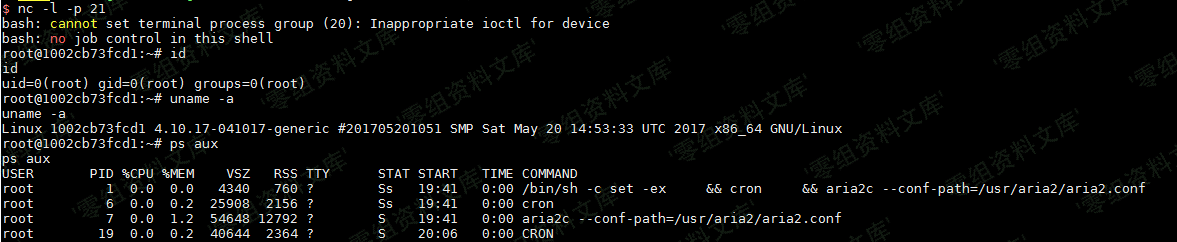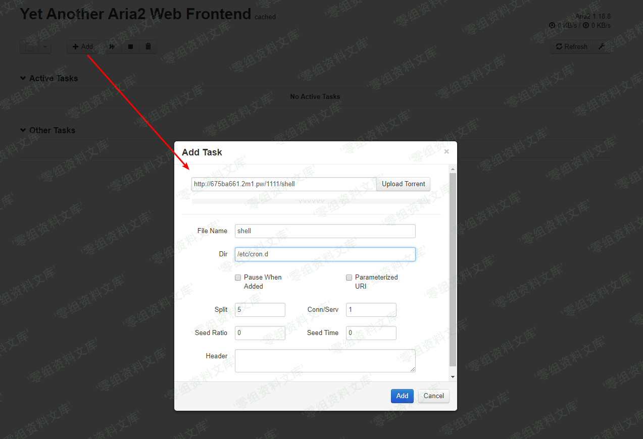 Aria2 < 1.18.8 ## 三、复现过程 因为rpc通信需要使用json或者xml,不太方便,所以我们可以借助第三方UI来和目标通信,如 `http://binux.github.io/yaaw/demo/` 。 `https://github.com/ianxtianxt/yaaw` 源码在这里,也可自行搭建。 打开yaaw,点击配置按钮,填入运行aria2的目标域名:`http://your-ip:6800/jsonrpc`:  然后点击Add,增加一个新的下载任务。在Dir的位置填写下载至的目录,File Name处填写文件名。比如,我们通过写入一个crond任务来反弹shell:  这时候,arai2会将恶意文件(我指定的URL)下载到`/etc/cron.d/`目录下,文件名为shell。而在debian中,`/etc/cron.d`目录下的所有文件将被作为计划任务配置文件(类似crontab)读取,等待一分钟不到即成功反弹shell:  如果反弹不成功,注意crontab文件的格式,以及换行符必须是`\n`,且文件结尾需要有一个换行符。