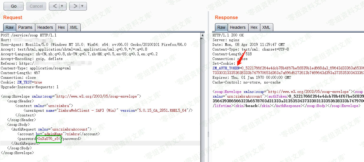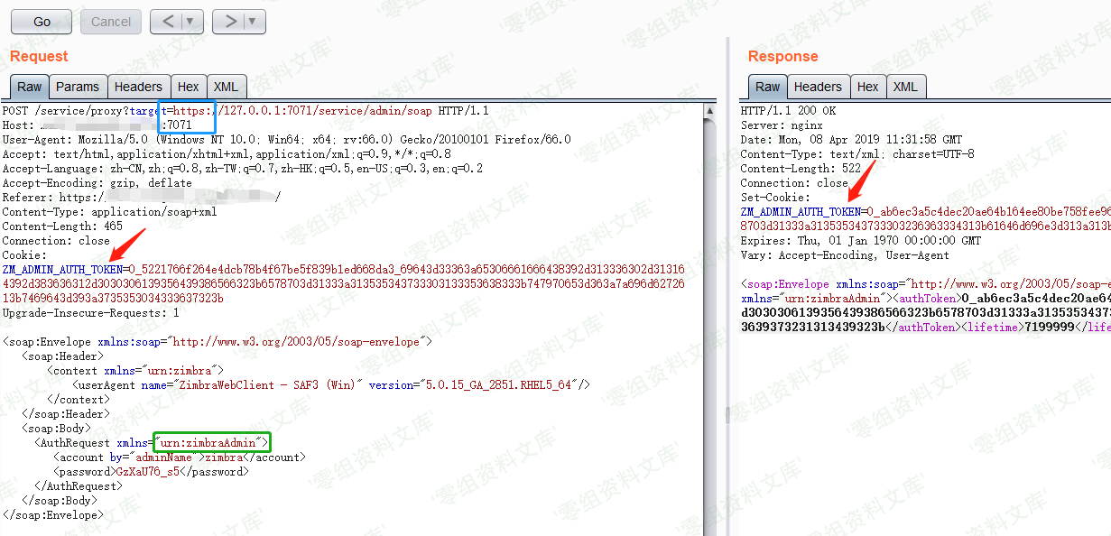 将上一步获取到了低权限token添加到cookie中,将xmlns=”urn:zimbraAccount”修改为xmlns=”urn:zimbraAdmin”,在Host字段末尾添加“:7071”,URL中的target要使用https协议。然后发送请求即可获得admin权限的token。
