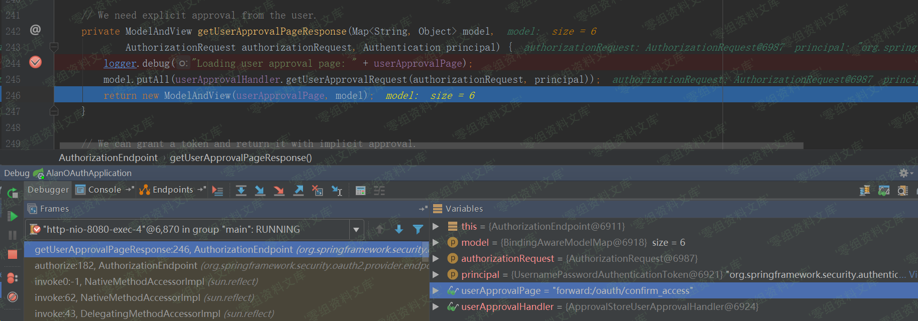 生成对应的model和view,之后将会forward到/oauth/confirm_access。为简单起见,我省略中间过程,直接定位到org/springframework/security/oauth2/provider/endpoint/WhitelabelApprovalEndpoint.java:20