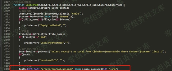 跟随`LoadInMod`函数来到`/e/class/moddofun.php`,可以看到上传文件处使用`make_password(10)`对时间进行加密然后拼接成为上传的文件名,这样就无法得到用户名