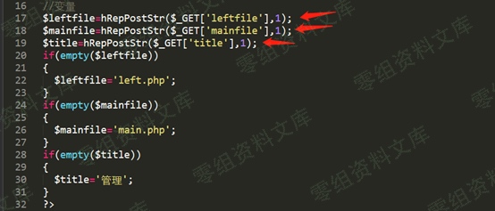 漏洞出现的页面在/e/admin/openpage/AdminPage.php,浏览漏洞页面代码,发现使用hRepPostStr函数对leftfile、title、mainfile参数进行处理