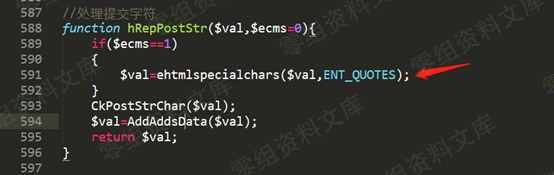 跟进hRepPostStr函数,发现htmlspecialchars进行实体编码过滤,而且参数用的是ENT_QUOTES(编码双引号和单引号)