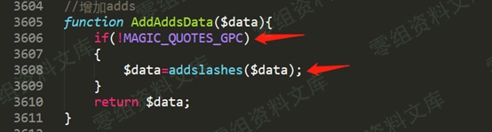 跟进AddAddsData函数,分析代码:如果没有开启magic_quotes_gpc函数,就使用addslashes函数对参数中的特殊字符进行转义处理