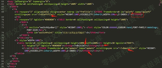 继续浏览代码,发现在网页输出时, $leftfile、$mainfile参数的输出位置是iframe标签的src里面,由于代码没有对别的恶意字符进行处理,此时可以构造javascript:alert(/xss/),iframe标签可以执行javascript代码,此时就会触发XSS代码。
