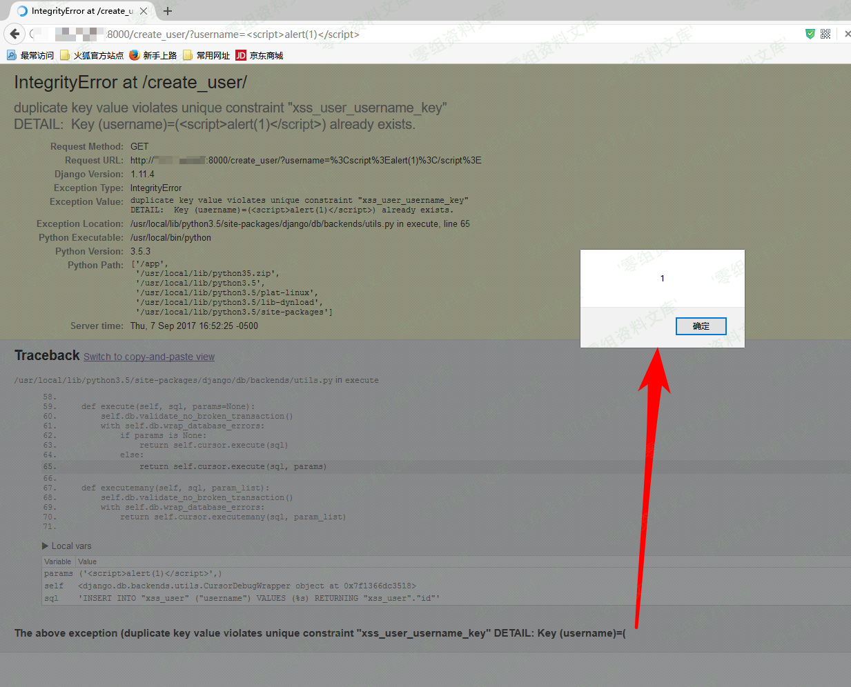 访问`http://url:8000/create_user/?username=alert(1)`创建一个用户,成功;再次访问`http://url:8000/create_user/?username=alert(1)`,触发异常: