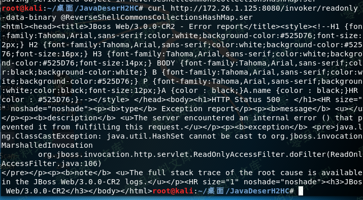 这个时候在这个目录下生成一个ReverseShellCommonsCollectionsHashMap.ser文件,然后我们curl就能反弹shell了