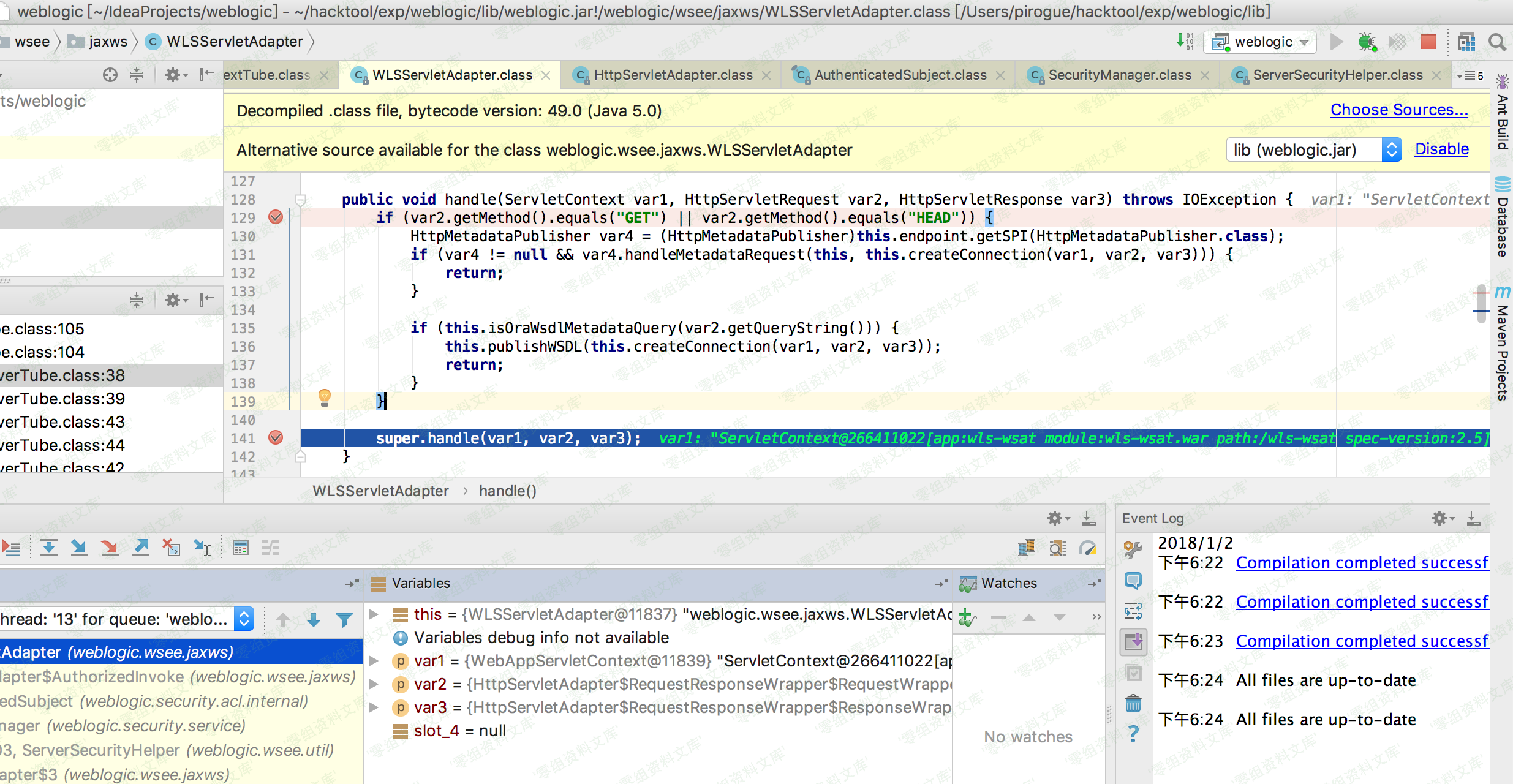 当开启调试模式,ping时,WLSServletAdapter对请求进行接收处理,执行到super.handle(var1, var2, var3);后,跟进关键代码如下: