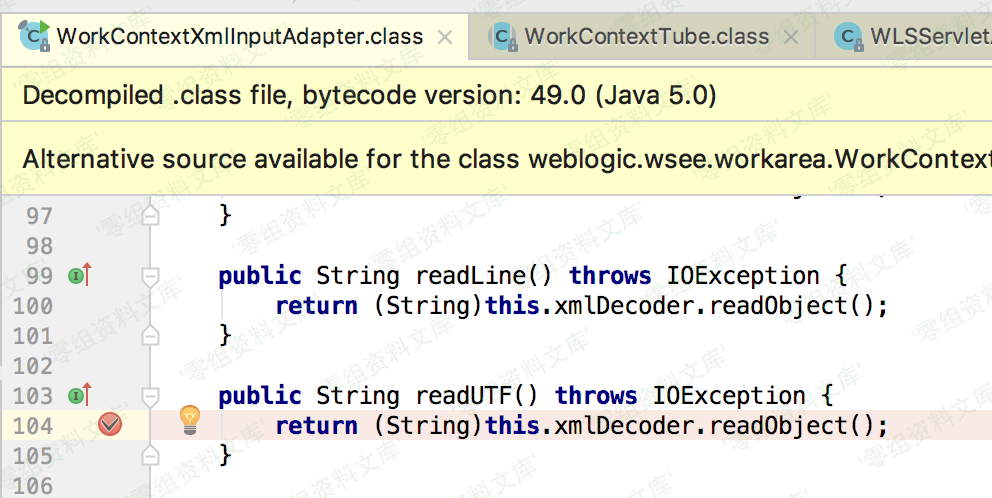 下面是对WorkContextXmlInputAdapter和创建xml反序列化对象后如何执行的readObject方法造成rce的代码跟踪