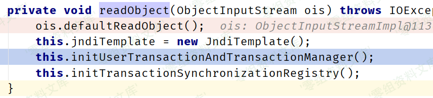 然后通过反射调用JtaTransactionManager的readObject(),跟进