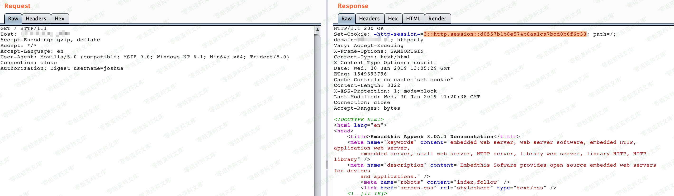 * 其7.0.3之前的版本中,对于digest和form两种认证方式,如果用户传入的密码为null(也就是没有传递密码参数),appweb将因为一个逻辑错误导致直接认证成功,并返回session。