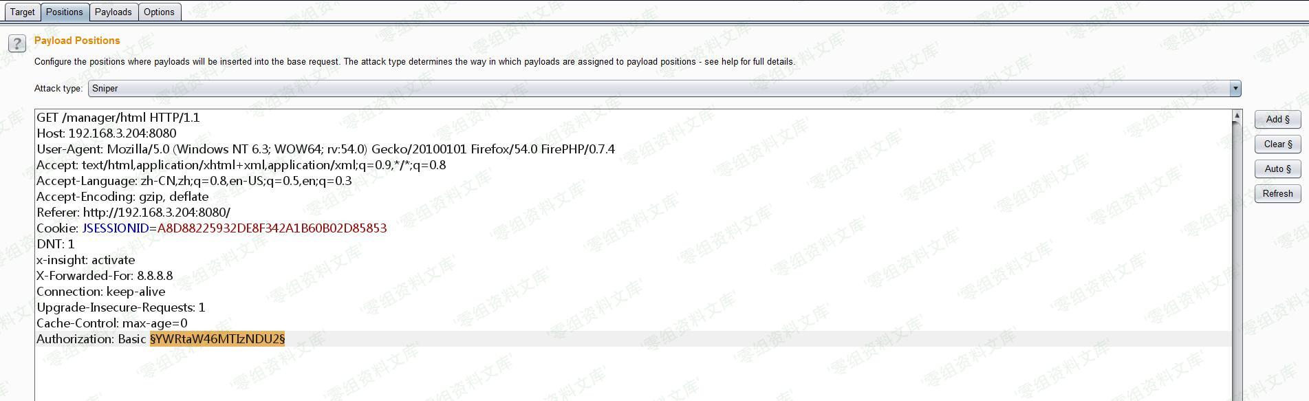 将数据包发送到Intruder模块,添加一个变量: