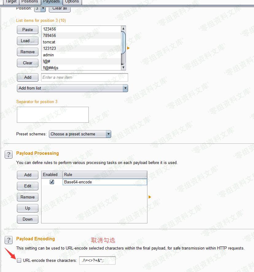 `[用户名]:[密码]`这样的格式进行`base64encde`才可以发送出去,我们设置三个迭代payload分别代表:用户名、:、密码、。