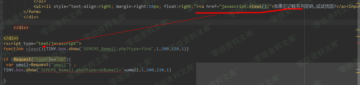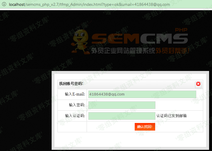 从代码可以看到,当点击登录按钮旁边的链接“如果忘记账号与密码,试试找回?”,时,会执行 js的views() 函数,该函数是弹出一个对话框并向SEMCMS_Remail.php?type=find 发送请求,让用户填写要接收重置后密码的邮箱地址,如下: