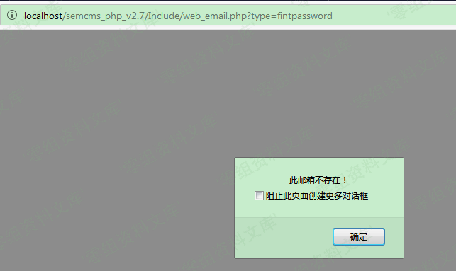 代码会根据用户输入的E-mail地址,查找 sc_user 表,看是否存在使用该E-mail地址的用户,如果存在,则随机生成4位数的认证码,并将其拼接到一个密码重置链接中,最后以邮件的形式发送给用户。用户点击邮件中的密码重置链接即可;但如果不存在,则弹出对话框,提示“此邮箱不存在!”,如图: