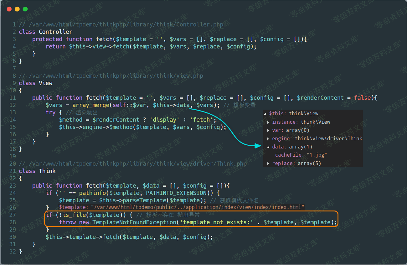 我们跟进到 Template 类的 fetch 方法,可以发现可控变量 $vars 赋值给 $this->data 并最终传入 File 类的 read 方法。而 read 方法中在使用了 extract 函数后,直接包含了 $cacheFile 变量。这里就是漏洞发生的关键原因(可以通过 extract 函数,直接覆盖 $cacheFile 变量,因为 extract 函数中的参数 $vars 可以由用户控制)。