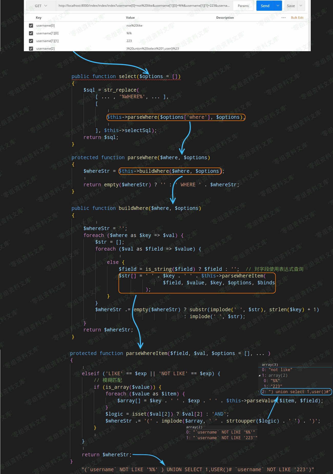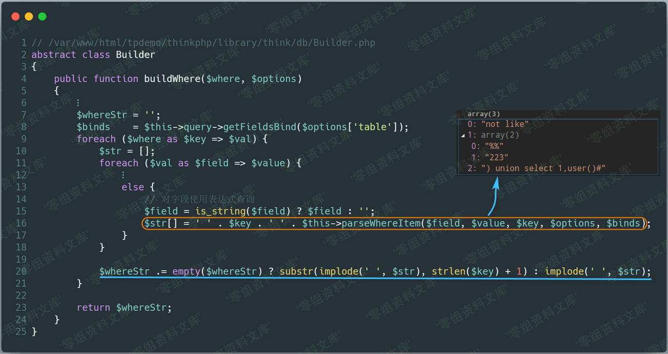 上面的 $this->builder 为 \think\db\builder\Mysql 类,该类继承于 Builder 类,所以接着会调用 Builder 类的 select 方法。在 select 方法中,程序会对 SQL 语句模板用变量填充,其中用来填充 %WHERE% 的变量中存在用户输入的数据。我们跟进这个 where 分析函数,会发现其会调用生成查询条件 SQL 语句的 buildWhere 函数。