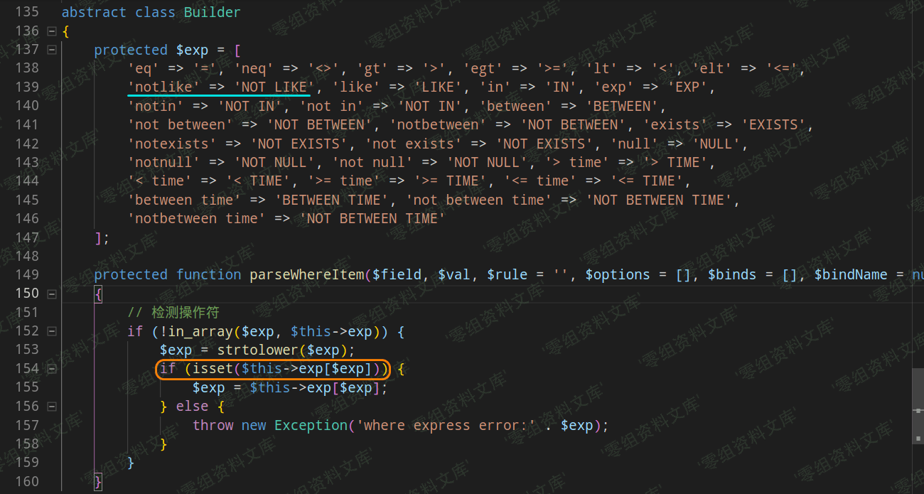 我们跟进 parseWhereItem 方法,发现当操作符等于 NOT LIKE 时,程序所使用的 MYSQL 逻辑操作符竟然可由用户传来的变量控制(下图 第23行 ),这样也就直接导致了 SQL注入漏洞 的发生。