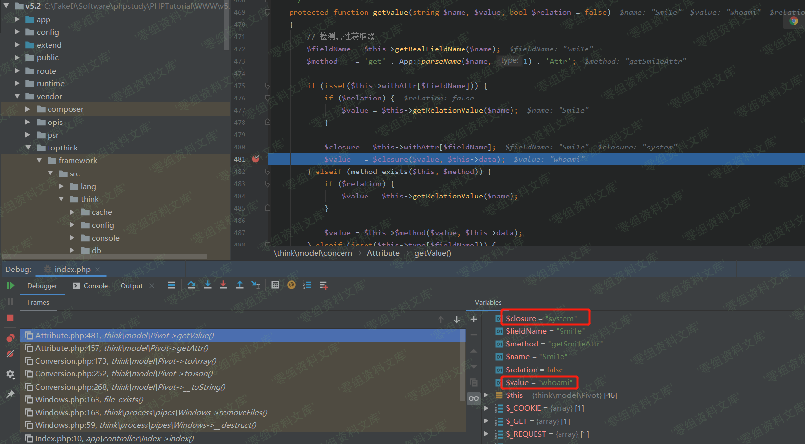 这里$fieldName、$this->withAttr,导致$closure也可控,最终直接产生RCE。如下图
