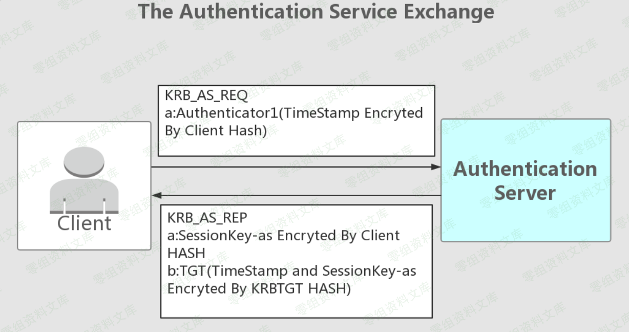 > AS->Client:发送 Client 密码加密的 sessionkey-as 和票据 TGT(KBRTGT HASH 加密的 sesionkey-as 和 Timestamp)