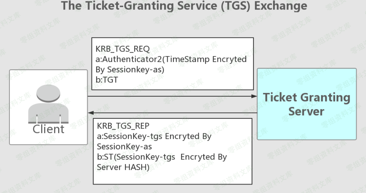 > TGS->Client:发送密文(由 sessionkey-as 加密的 sessionkey-tgs)和票据 ST(由 server 密 码 hash 加密的 sessionkey-tgs)