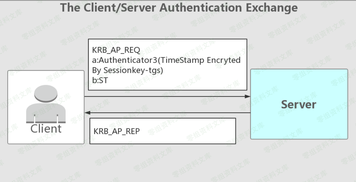 > Client->Server 发送 Authenticator3(sessionkey-tgs 加密 timestamp)和票据 ST(Server 密码 hash 加密的 sessionkey-tgs)