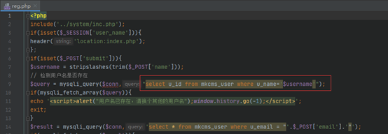 在reg.php这个文件中,第9行处对`$username`这个参数进行了查询拼接,