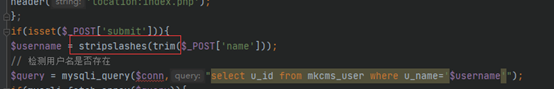 但是在第7行处,`$username`的值是来自于`POST`传递的`name`参数,当`name`参数到达`reg.php`这个文件之后,`stripslashes()`函数将`name`的值进行了去除“`\`”处理,