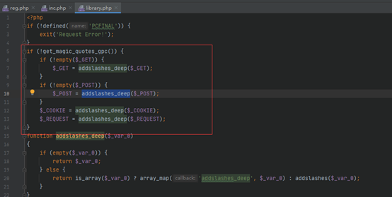 根据`include`,跳转到`/system/library.php`中,我们可以发现这里系统对`GET`、`POST`等参数进行了`addslashes_deep()`函数处理,即对参数传递时加上了一个“`\`”,