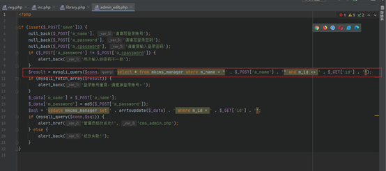 在`admin_edit.php`文件第10行处,系统进行了数据库查询,拼接了两个参数,一个是`POST`传递的`a_name`,一个是`GET`传递的`id`,可以看出,系统并未对参数在这里做任何的过滤处理,