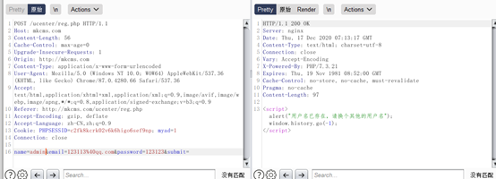 抓包注册`admin`用户,提示已存在