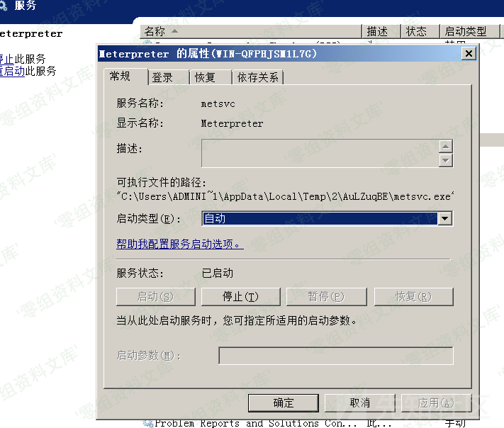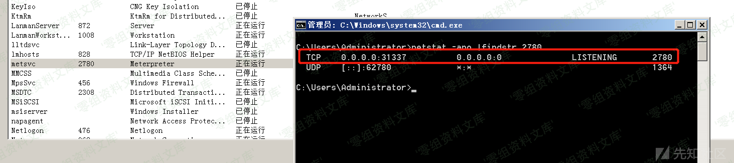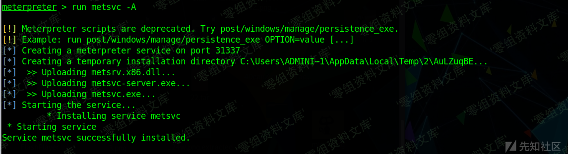同时会新建一个服务,其显示名称为`Meterpreter`,服务名称为`metsvc`,启动类型为”自动”,默认绑定在31337端口。
