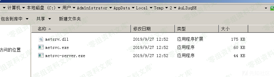 运行之后msf会在`%TMP%`目录下创建一个随机名称的文件夹,然后在该文件夹里面生成三个文件:`metsvc.dll`、`metsvc-server.exe`、`metsvc.exe`