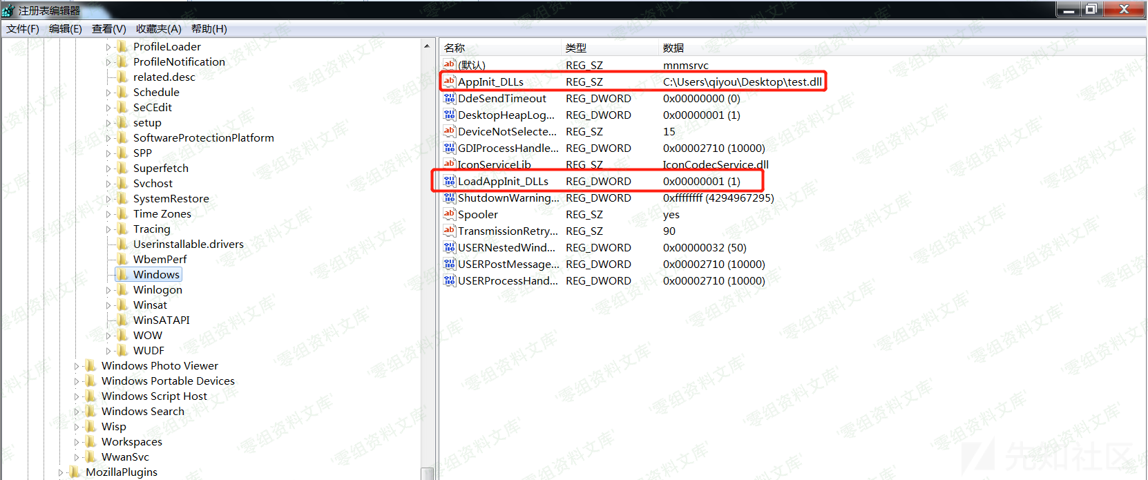 其注册表位置为:`HKEY_LOCAL_MACHINE\SOFTWARE\Microsoft\Windows NT\CurrentVersion\Windows\AppInit_DLLs`,把`AppInit_DLLs`的键值设置为我们dll路径,将`LoadAppInit_DLLs`设置为1