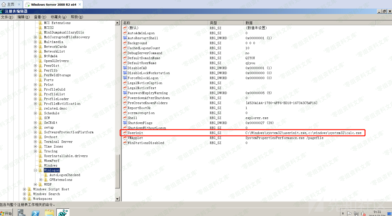 注册表路径为:`HKLM\SOFTWARE\Microsoft\Windows NT\CurrentVersion\Winlogon\Userinit`,我们添加一个我们启动的程序,多个程序用逗号隔开