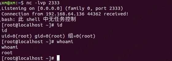 在攻击机中`nc -lvp 2333`获得root权限shell